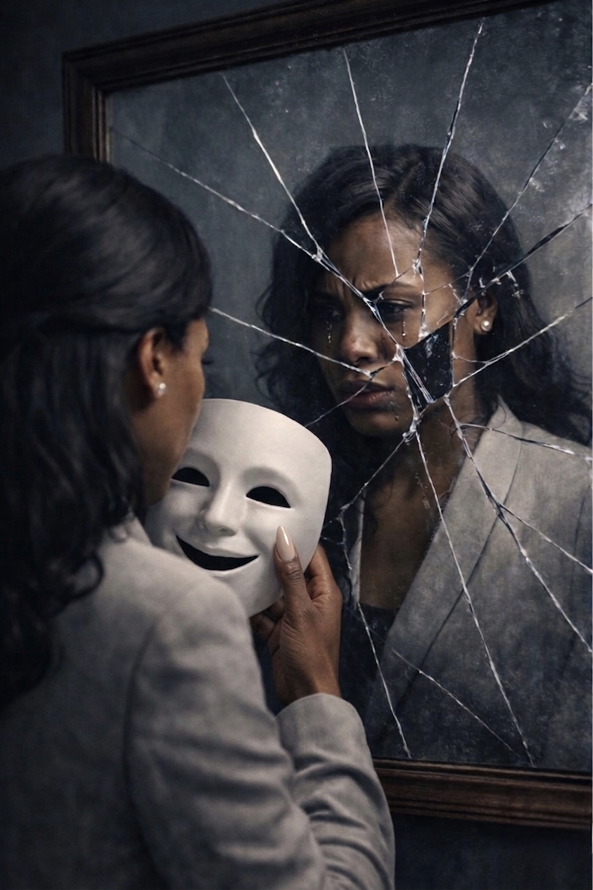 Think of the curated self-improvement influencer: carefully filtered, performing confidence and abundance, never once letting the real show. The mask does not just cover the self. Over time, it becomes the only version of self that is allowed to exist. The mirror reflects a carefully managed image rather than an authentic one (Patterson & Joseph, 2007).