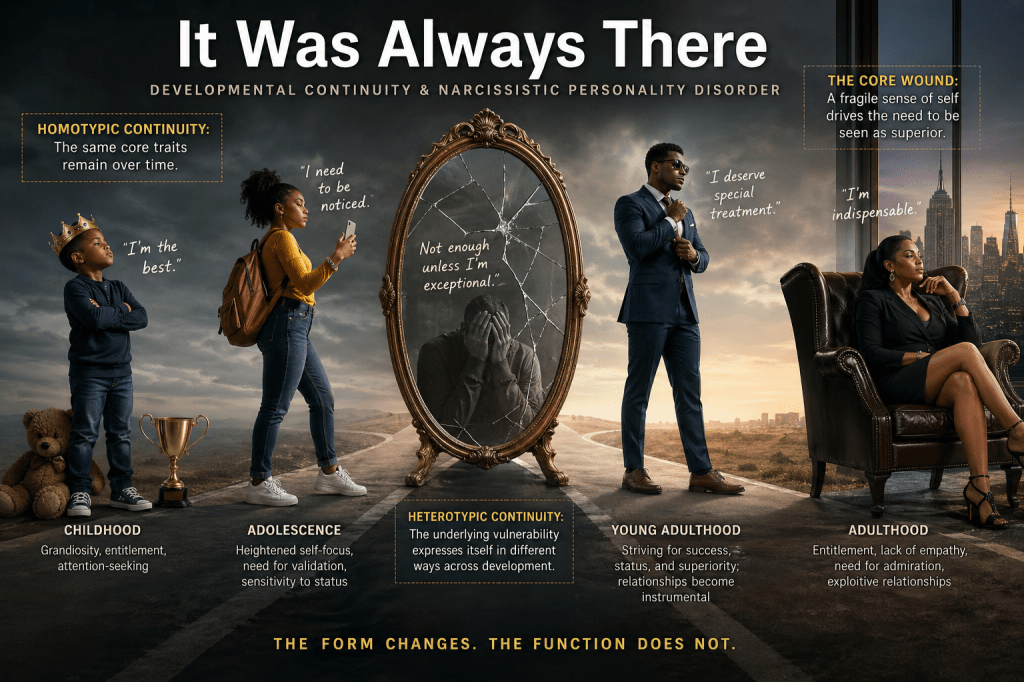 One of the most persistent myths about Narcissistic Personality Disorder is that it appears suddenly in adulthood, fully formed, as though the person simply decided one day to stop caring about others. Developmental science tells a very different story. NPD does not appear in adulthood without a history. It arrives with one. Understanding that history requires two conceptual tools that developmental psychopathology has spent decades refining: homotypic continuity and heterotypic continuity, and NPD is a compelling case study in both (Fortunato & Speranza, 2023).